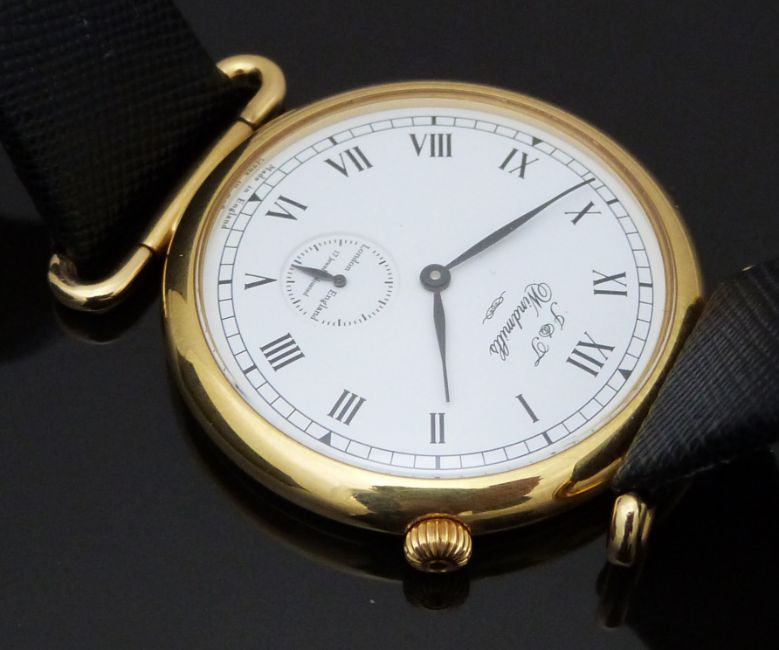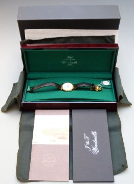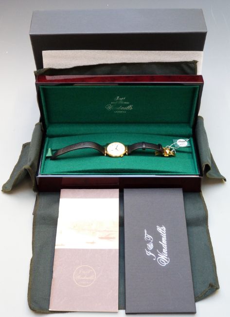 Joseph & Thomas Windmills 18ct gold gentleman's wristwatch ref. WGS20002/01 with blued hands, inset subsidiary seconds dial, black Roman numerals, railroad minute track, white dial and 17 jewel movement, on black leather strap, case diameter 37.5mm, new with tags in original box with related paperwork.
