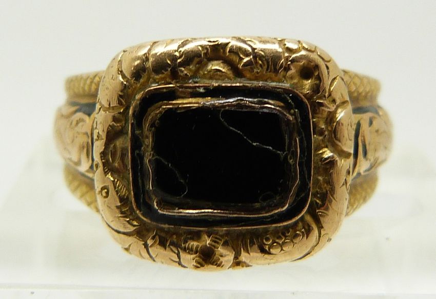 Victorian yellow metal ring set with black enamel, 6.5g (size M)