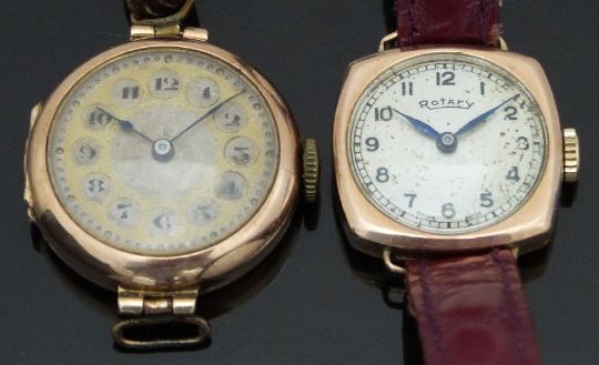 Two 9ct gold ladies wristwatches both with blued hands and black Arabic numerals, one Rotary on burgundy snake effect strap, the other Edwardian style.