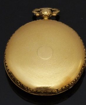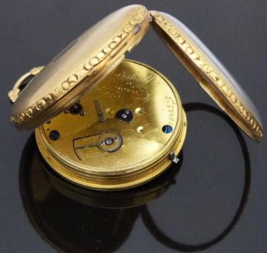 William Marshall of London 18ct gold open faced pocket watch with gold hands and Roman numerals, engraved self coloured dial, engraved case and signed movement, case diameter 41mm, serial number 7268, 57.5g, in T H Millard Jeweller, Dolphin St, Bristol box.