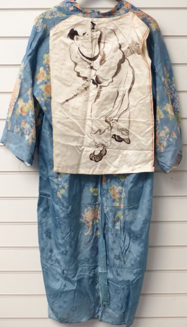 Japanese kimono or wrap with embroidered Japanese figural panel sewn to rear