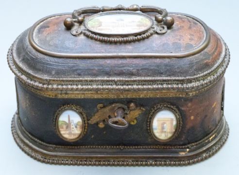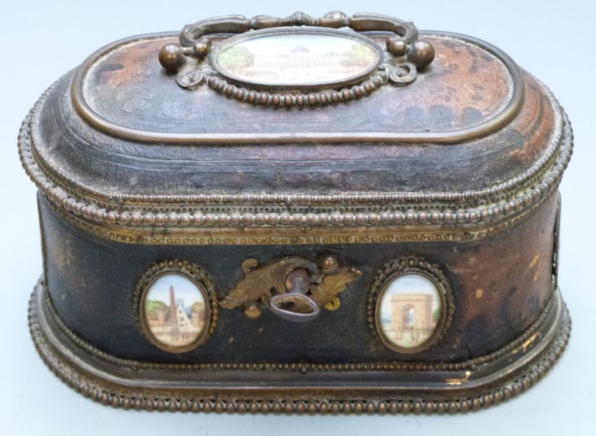 A 19th century cased pair of scent bottles, the case having gilt metal mounts to the tooled leather covering and with three painted miniature scenes in the classical style, the fitted interior containing two scent bottles with gilt mounts and painted floral panels to tops, length of case 15cm
