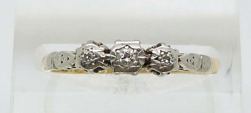 An 18ct gold ring set with three diamonds in a platinum setting (size Q)