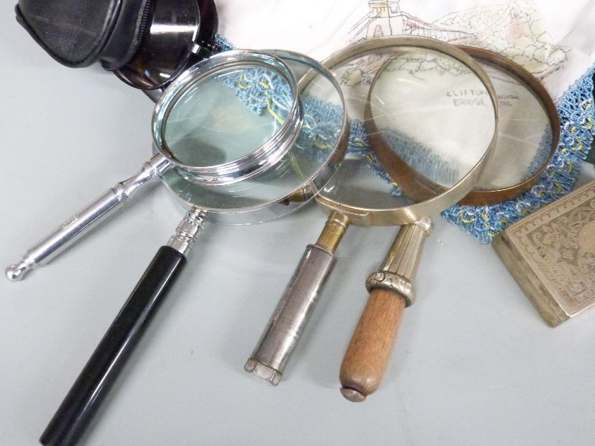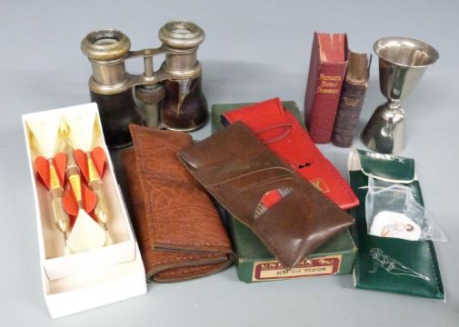 A quantity of mixed collectables to include Victorian glass negatives with two images of very early bicycles, miniature books, darts sets, field glasses by Jockey Club Paris, corkscrews, cigarette lighters etc
