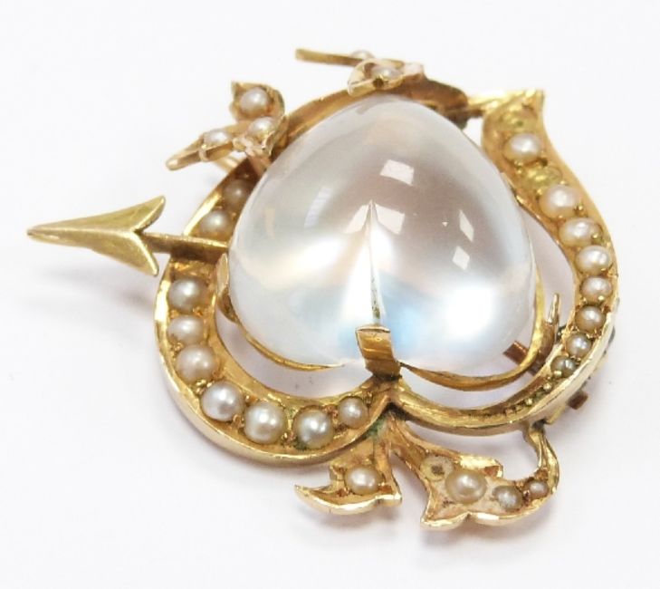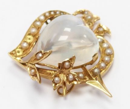 Victorian / Edwardian heart shaped brooch set with seed pearls and a large moonstone cut in a heart cabochon, width 3.3cm x length 3cm