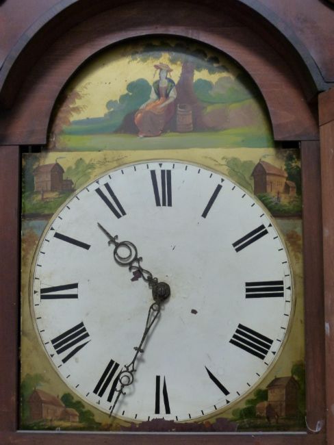 A 19thC oak and mahogany banded longcase clock with 30 hour movement striking on a bell, 33cm arch top, painted Roman dial decorated with rural scenes and turned pillars and swan neck pediments to the hood, raised on bracket feet, 220cm tall.
