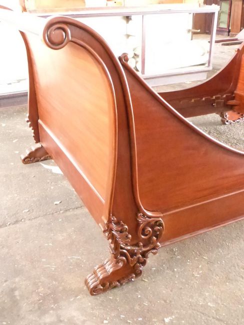 Carved mahogany sleigh bed with scroll end, overall size L262 x W163 x H123, mattress size 200x150cm
