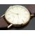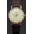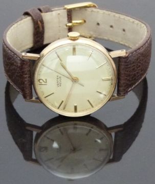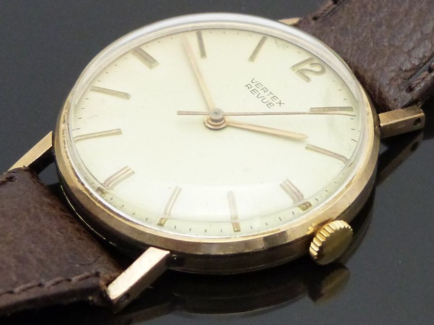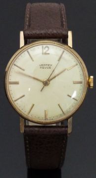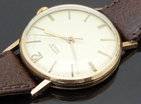 Vertex Revue 9ct gold gentleman's wristwatch with gold hands and baton markers, champagne dial and signed 17 jewel calibre 350 movement, on brown leather strap, case diameter 31mm, serial number 396850.