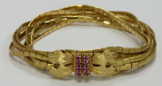 An 18ct gold bracelet made up of flat textured links set with rubies to the clasp, 49.5g