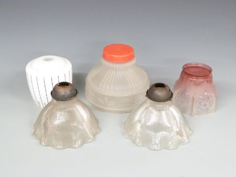 Binks Arts & Crafts / Art Nouveau lamp base in the manner of Benson, together with a pair of brass table lamps marked The King of Diamonds, H48cm, and five various glass lamp shades