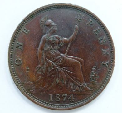 Queen Victoria 1874 bun head bronze penny, OT signature to bust, EF+, near unc, toned