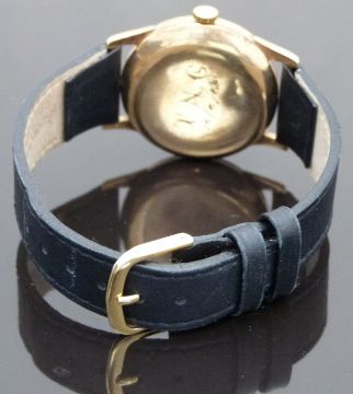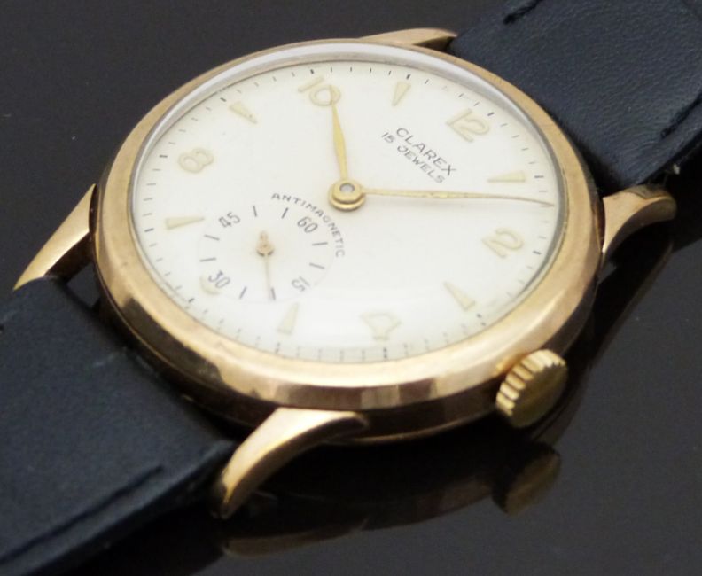 Clarex 9ct gold gentleman's wristwatch with inset subsidiary seconds dial, gold hands, Arabic numerals and triangular markers, cream dial and 15 jewel calibre 170 movement, on black leather strap, case diameter 32mm.