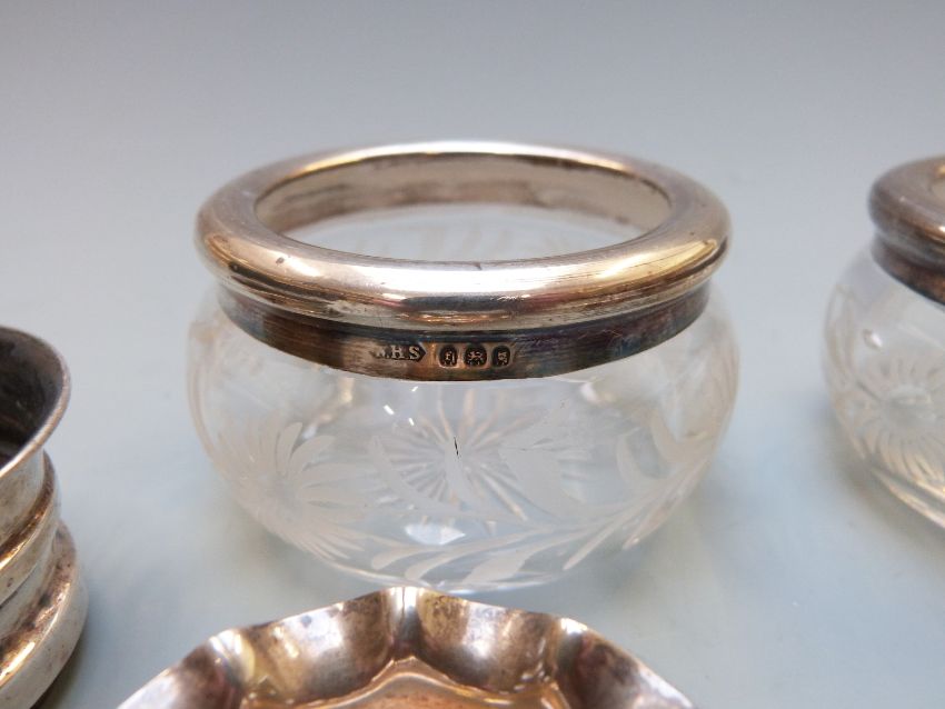 Three pairs of hallmarked silver and silver mounted salts, one pair on three ball feet Birmingham 1902, another with cut glass bases the other to suit glass liners