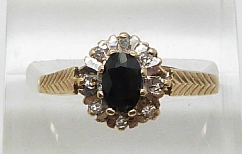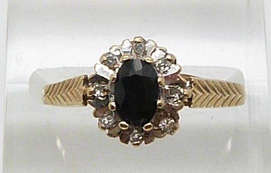 A 9ct gold ring set with an oval sapphire surrounded by diamonds (size R)