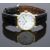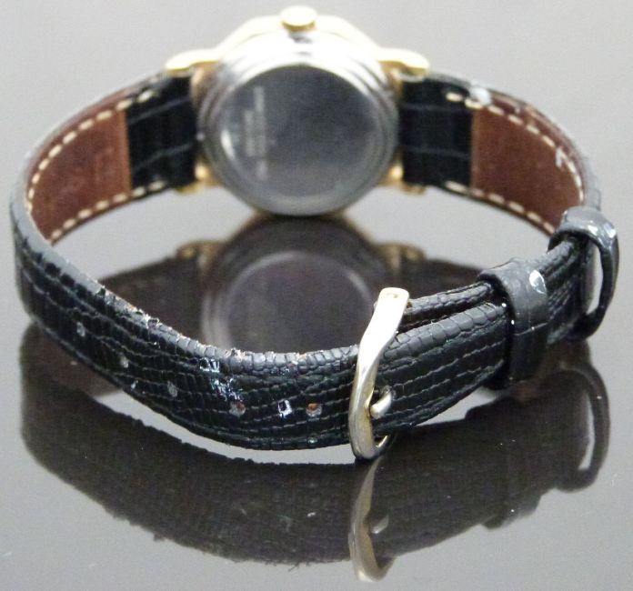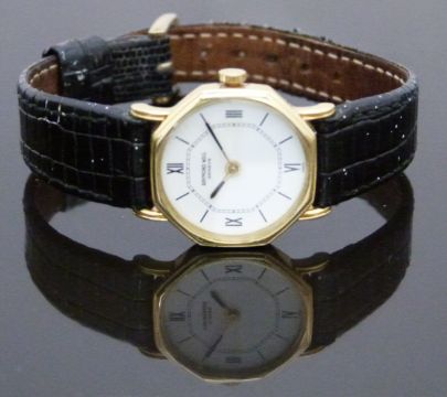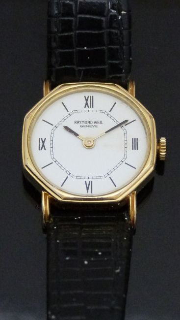 Raymond Weil gold plated ladies wristwatch with black hands and hour markers, white dial, gold plated octagonal case and signed 17 jewel calibre 2012 movement, on black snake effect leather strap, case diameter 23mm.