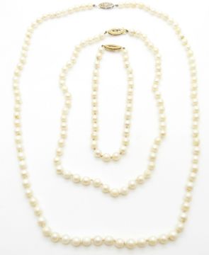 A cultured pearl necklace and matching bracelet with 9ct gold clasps and another cultured pearl necklace