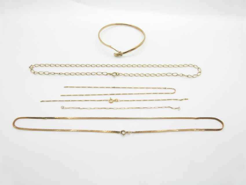 A yellow metal bangle and two 9ct gold necklaces, 15.8g