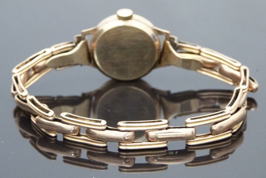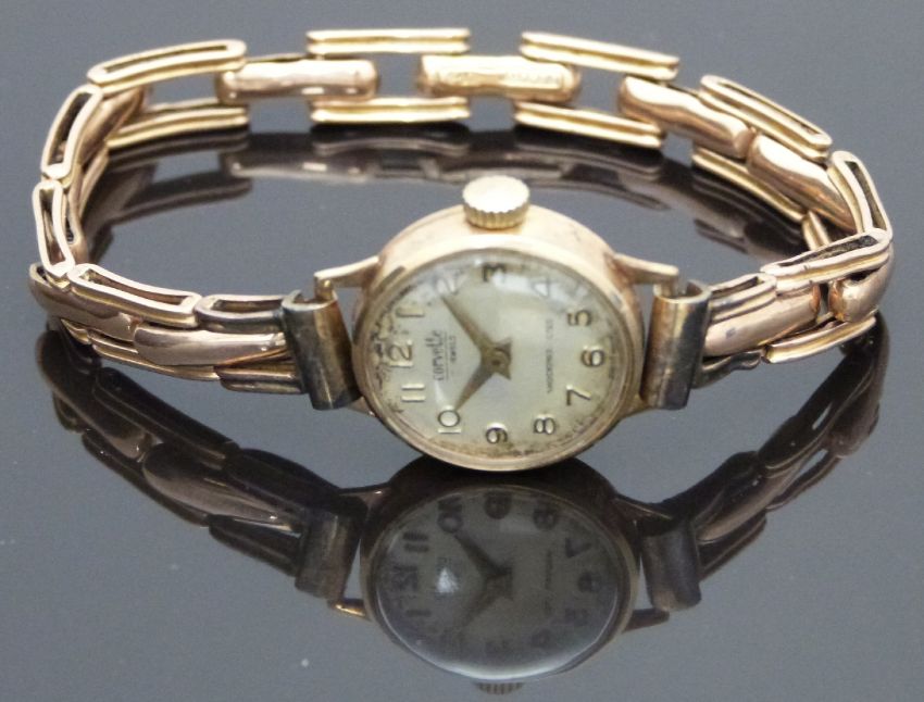 Corvette 9ct gold ladies wristwatch with gold hands and Arabic numerals, silver dial and 17 jewel calibre 921ST movement, on 9ct gold expanding bracelet, case diameter 19.5mm, 16.8g.