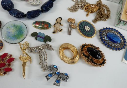 A collection of costume jewellery including 9ct gold crucifix and chain, silver necklace, brooches, etc