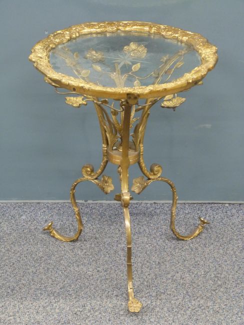 Gilt metal cut glass topped tripod table, diameter 40cm, height 52cm