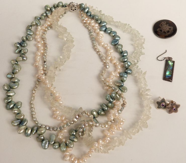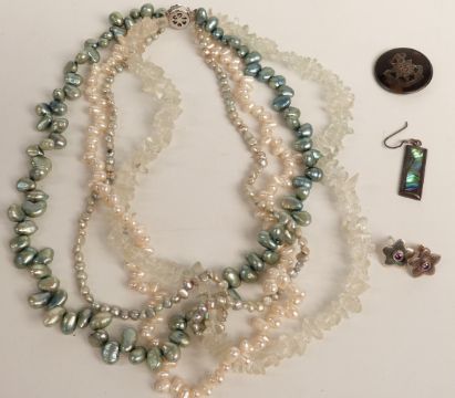 A collection of jewellery including The Royal Sussex brooch, silver bracelet, silver earrings, costume jewellery, glasses, pearls etc