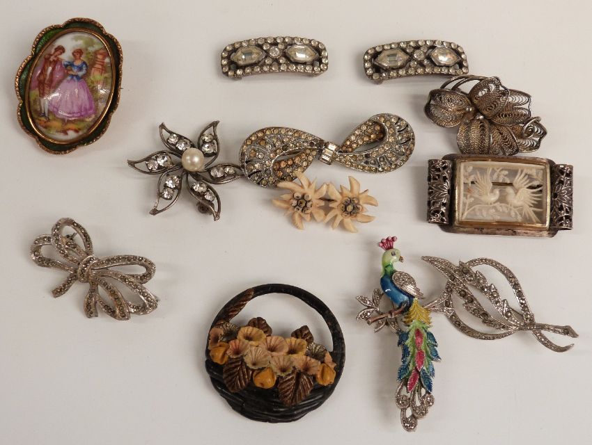 A collection of costume jewellery including brooches, filigree brooch, glasses, pocket watch face, paste buckles, cufflinks, rolled gold studs, a pair of cufflinks in the form of a cardamom pod and clove etc