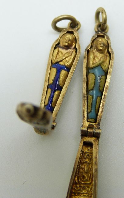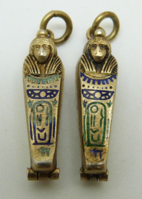 Two Egyptian charms each depicting a sarcophagus with mummy
