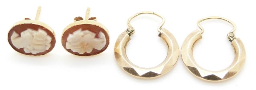 A pair of 9ct gold earrings and a pair of 18ct gold studs set with cameos
