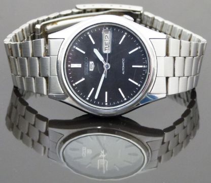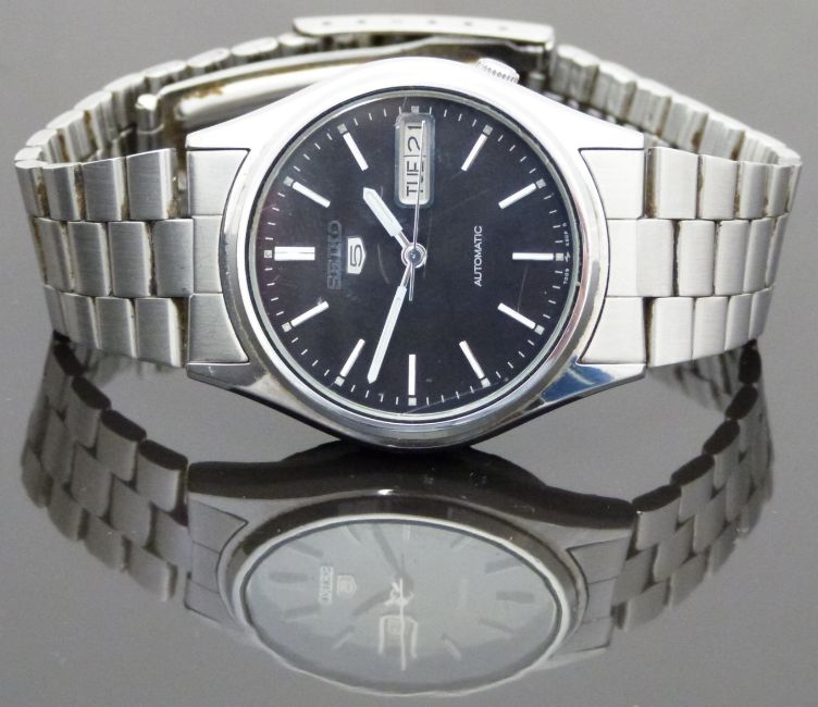 Seiko 5 gentleman's automatic wristwatch ref. 7009-3100 with day and date aperture, luminous hands, white baton markers, black dial and calibre 7009 movement, on stainless steel bracelet, case diameter 35mm, serial number 8N2112, in original box.