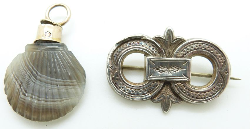 Victorian carved agate pendant in the form of a shell and a silver Victorian brooch