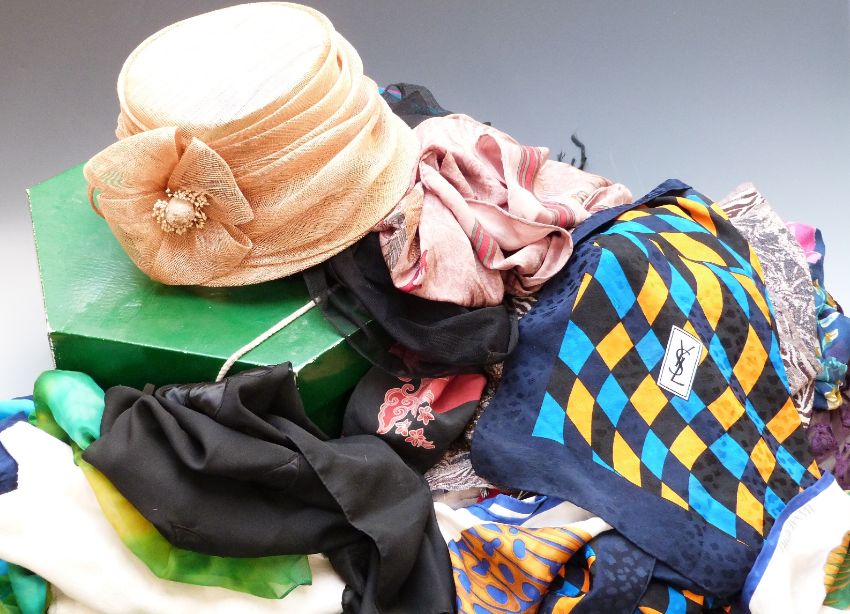 A collection of ladies designer scarves including Yves Saint Laurent example with hand rolled edge, Guy Laroche etc, a black lace throw, Victoria's Secret shawl and embroidered shawl, ladies hat etc