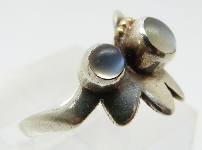 A silver ring set with two moonstone cabochons (size M)