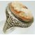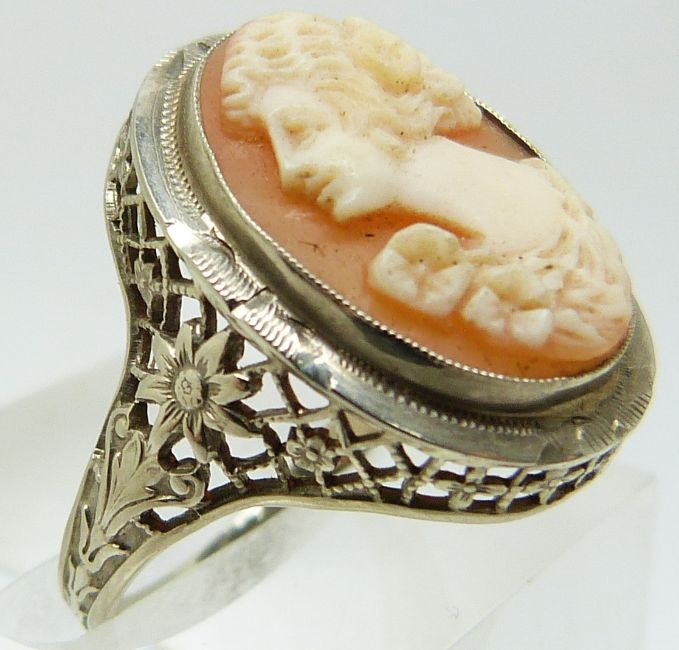 A 14k white gold ring set with a shell cameo and with pierced shoulders, size L