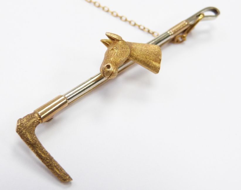 A 9ct gold brooch in the form of a horse and whip with textured detail, 6.5g, width 6cm x length 1.5cm