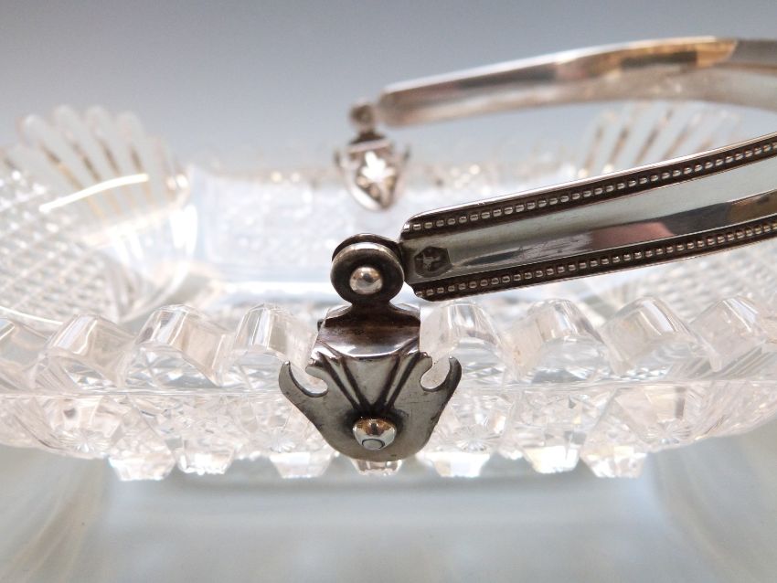 Late 19th or early 20th century cut glass crystal dish or bowl with Dutch white metal handle, marked for 833 quality silver and maker's mark GG above a bird, length 19cm