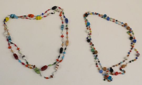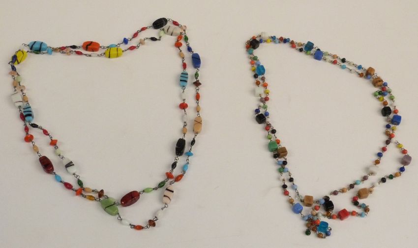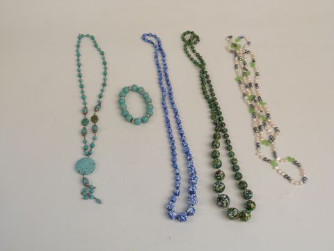 A collection of necklaces including a silver necklace made up of circular links, pearl, glass, agate etc