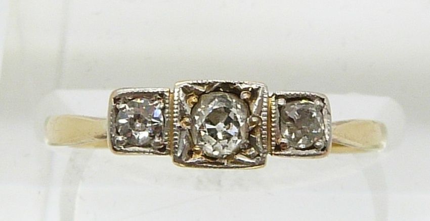 An 18ct gold ring set with three diamonds in a platinum setting (size N)