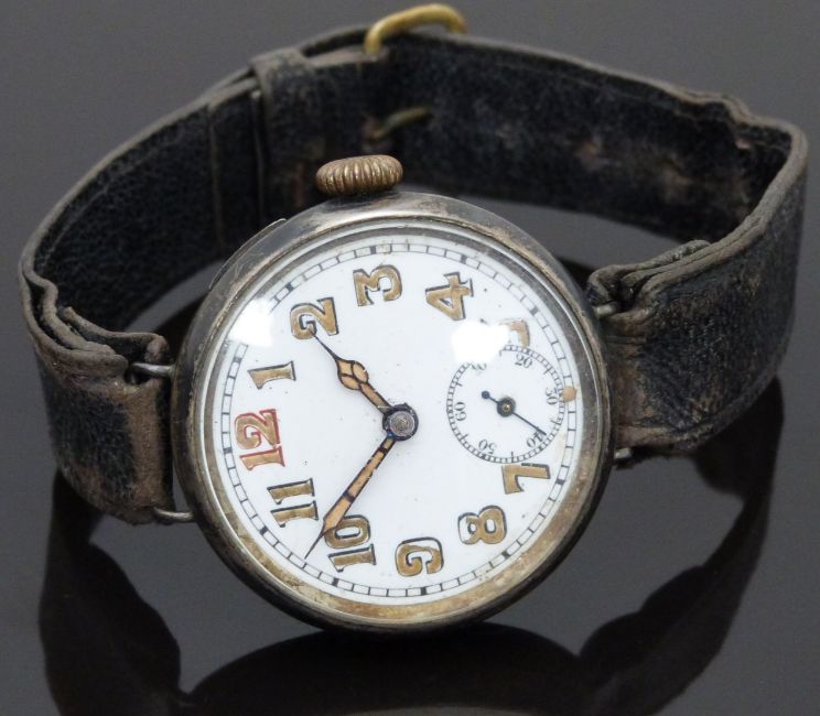 Gentleman's silver military style wristwatch with subsidiary seconds dial, luminous hands and Arabic numerals, railroad minute track, white enamel dial and engraved movement, case diameter 38.5mm.