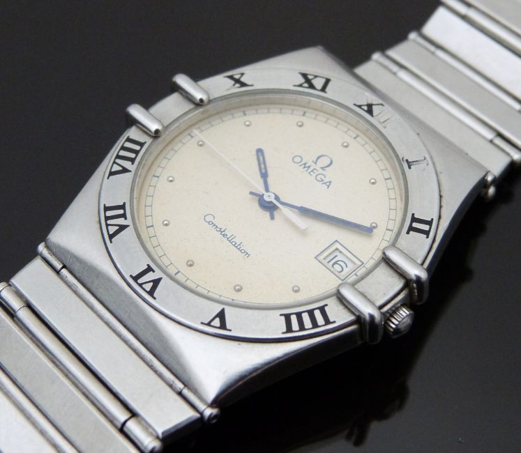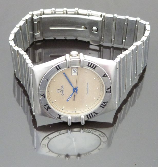 Omega Constellation gentleman's wristwatch ref. 396.1076 with date aperture, luminous blued hands, dot hour markers, champagne dial, Roman numerals to the bezel and 6 jewel quartz movement, on stainless steel bracelet, case diameter 32mm, serial number 255411, in Omega travel case with Safe Guard valuation dated 2012.