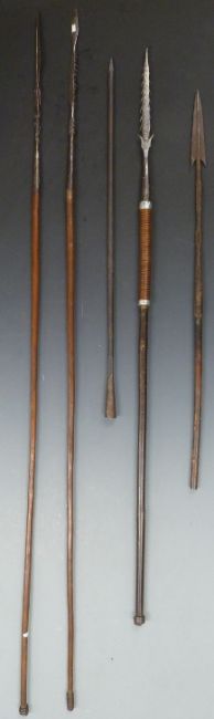 Five 19thC African spears (one with no handle) including three fish spears, various tribes. Maximum length 148cm