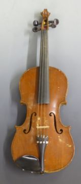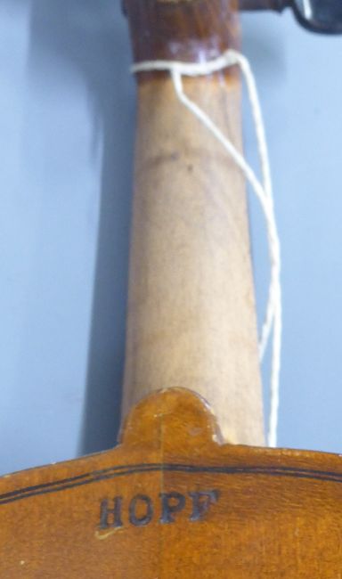 Hopf 20th century violin with two piece 36.5cm back, in original fitted case with two bows, impressed with maker to back and inside