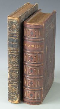 Holy Bible containing Old and New Testaments printed by George E. Eyre & William Spottiswoode 1861, with many steel engraved plates bound in full leather with gilt and black decoration, raised bands and decorated panels, with elaborate gilt page edging together with a copy of Book Of Common Prayer published Dublin 1816 in full decorated leather (2)