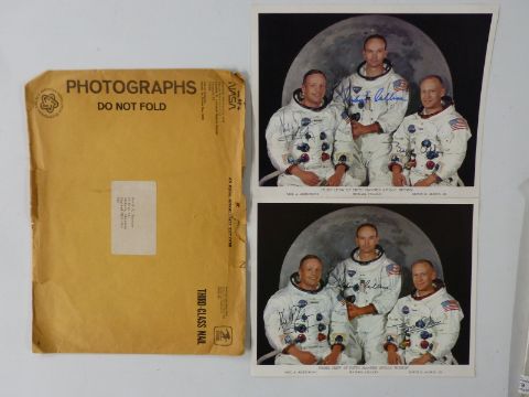 Two Apollo 11 autopen signed crew photographs comprising Neil Armstrong, Buzz Aldrin and Michael Collins, in original NASA envelope, letter from NASA date Jan 19 1970 relating to a 'nice letter to the crew of Apollo 11' signed by William J Drewes, also in original NASA envelope and Apollo 13 interest card