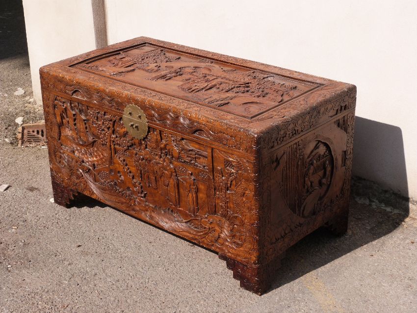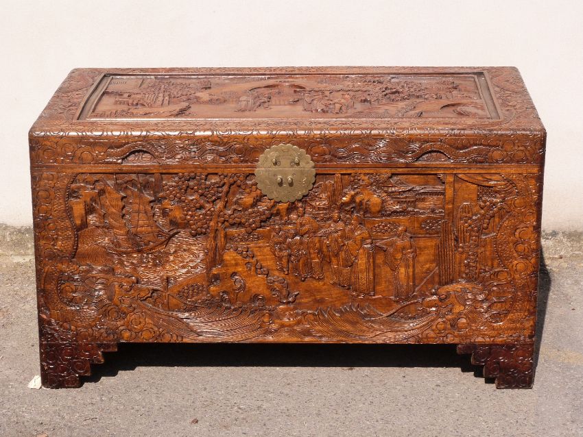 A carved Oriental camphorwood trunk, W101 x D53 x H56cm