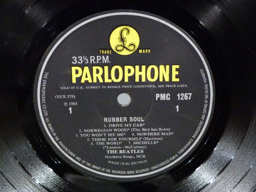 The Beatles - Rubber Soul (PMC1267) XEX 579 - 5 / 580 - 5, condition of record and cover appear Ex. Less scuff on side one, also Hits and Twist EPs and She Loves You, Hand and Can't 45s, all Ex