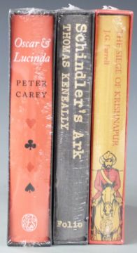 Thomas Keneally, Schindler’s Ark (London, Folio Society).  Black cloth.  Black slipcase.  Shrink wrapped.  Peter Carey, Oscar and Lucinda (London, Folio Society).  Orange cloth.  Black slipcase.  Shrink wrapped.  J. G. Farrell, The Siege of Krishnapur (London, Folio Society).  Orange pictorial cloth.  Red slipcase. Shrink wrapped.  3 volumes.