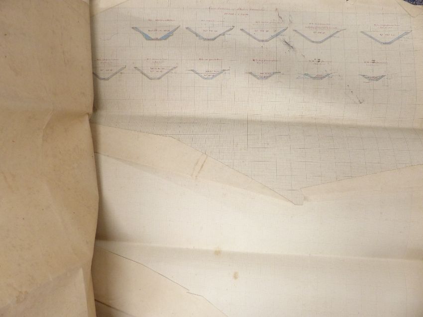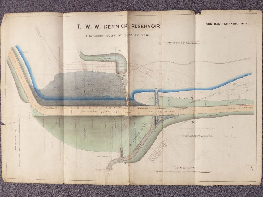 Sixteen early 20th century coloured architectural and engineering drawings relating to Kennick reservoir and dam, including plans of the dam, cross sections of the dam etc, largest approx 70x128cm