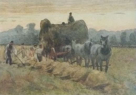 Frederick John Skill (1824 - 1881) watercolour haywain being loaded, signed lower left, 12 x 16.5cm
