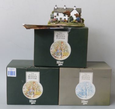 Three Lilliput Lane Beatrix Potter models including Hilltop, Tabitha Twitchet's and Tower Bank Arms