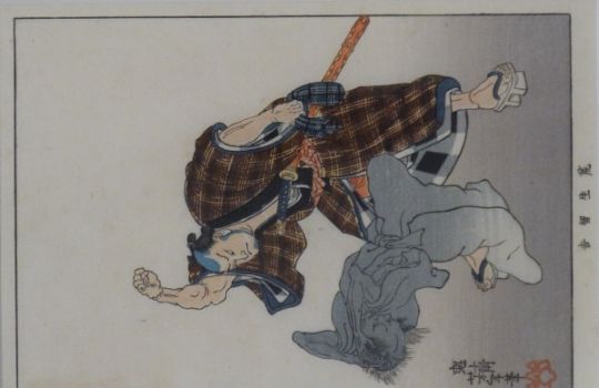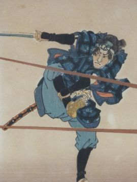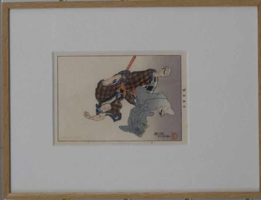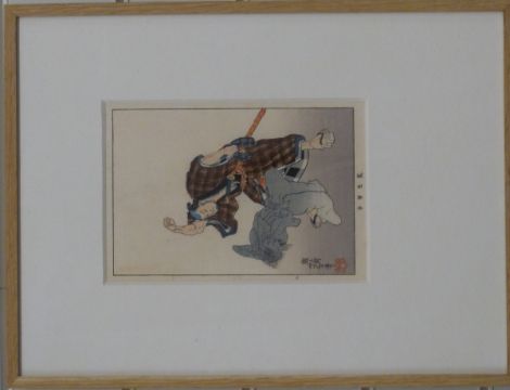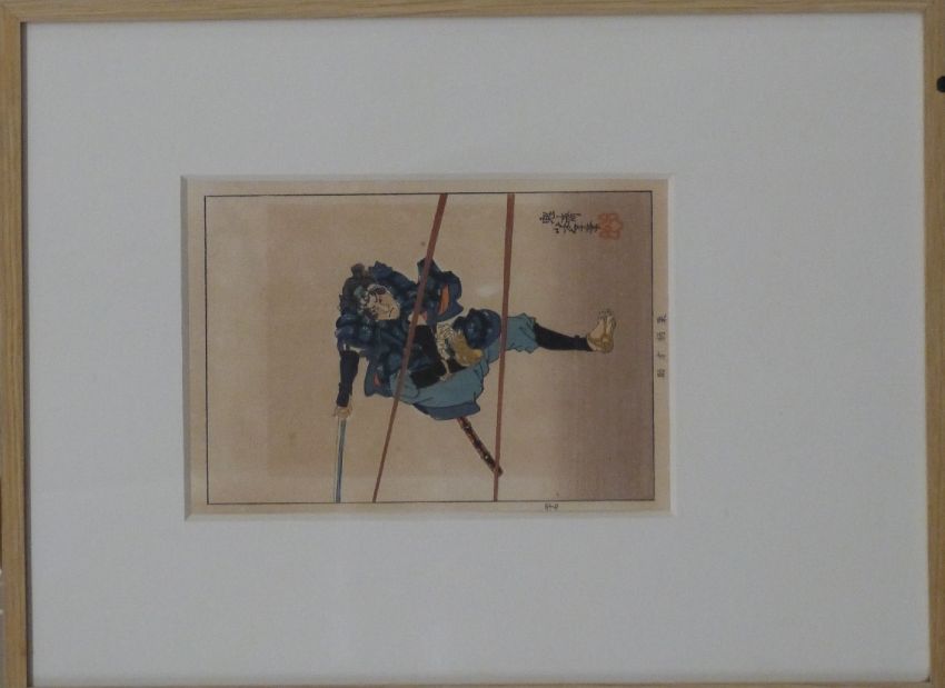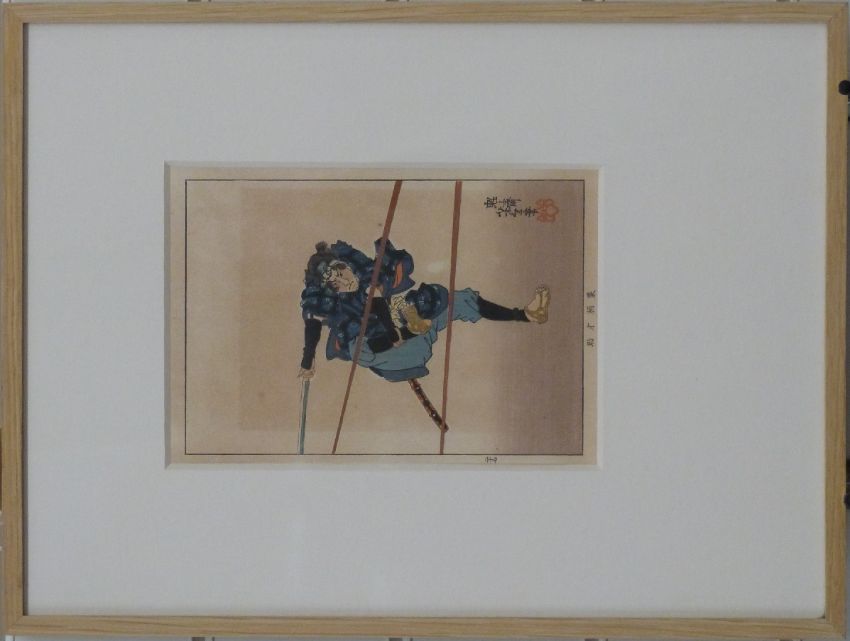 A pair of 19thC Japanese prints depicting warriors and script, 20 x 14cm